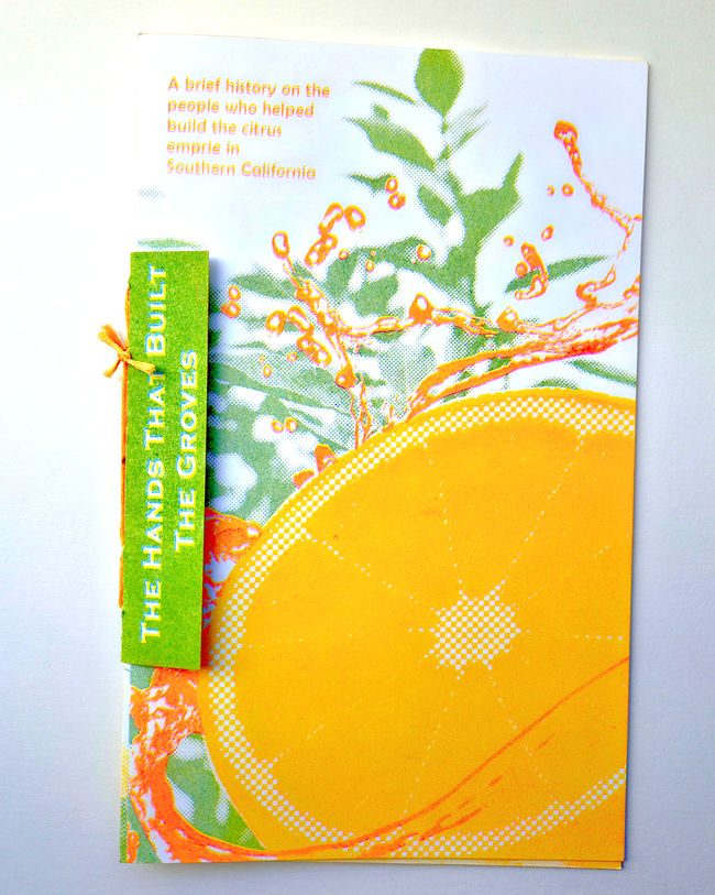 A risograph printed book providing a brief history of the citrus industry in Southern California with an emphasis on highlighting the stories of marginalized and exploited communities. Bound with a concertina folded spine and pamphlet stitching, this book is as much a sensory experience as it is an educational one. The book is designed to engage the viewer with the material and take a deeper look at the citrus laborers not for what they produce but for who they are as people..